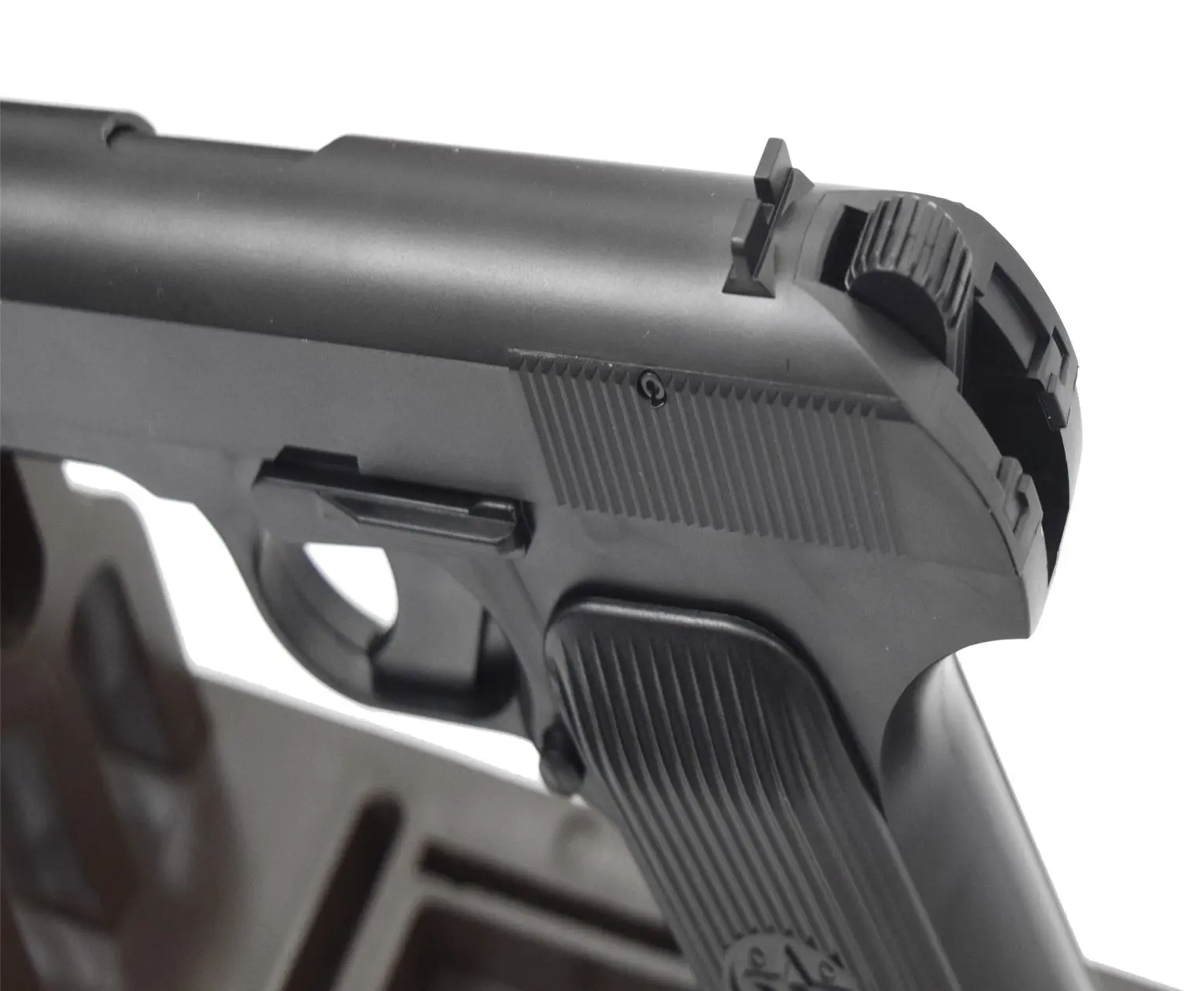 Пневматичний пістолет ТТ — чудовий вибір для розважальної стрільби та тренувань. Його розміри ідентичні бойовому прототипу, що надає йому реалістичного вигляду. Водночас вага моделі значно менша — лише 500 г, адже корпус виготовлений із міцного противоударного полімеру.